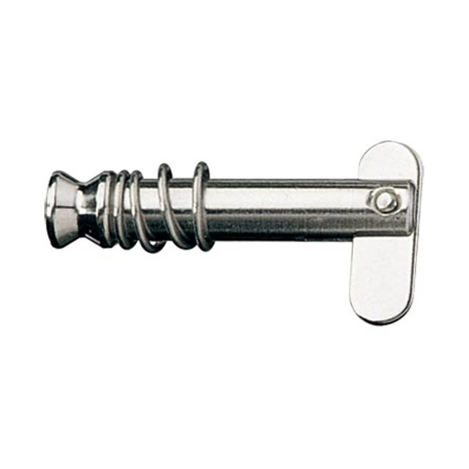 Axe en inox à éjection rapide. L’axe est équipé d’un linguet qui bascule pour sécuriser l’axe une fois celui-ci en place. le ressort opère une pression sur l’axe le maintenant bien en place et empêchant le linguet de se défaire.