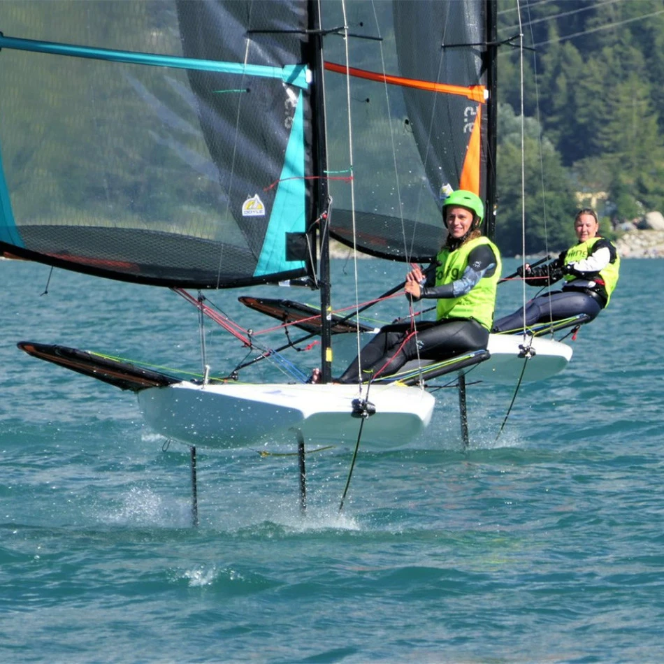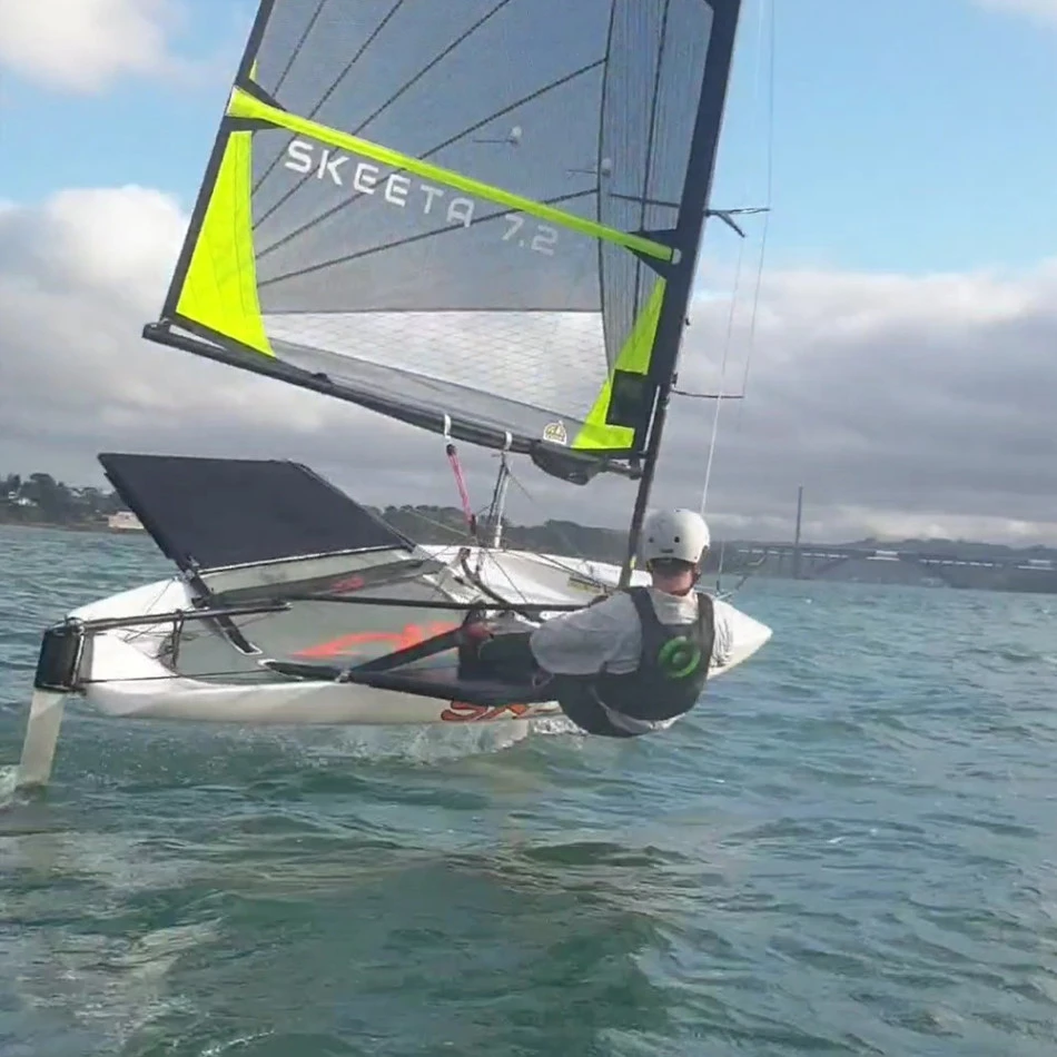 Une fois en vol, le Skeeta se comporte comme les foilers les plus performants. Sa forme de carène inspirée des Scows, courte et large, sera très appréciable lors des passages délicats comme les virements et empannages plus ou moins bien maitrisés.
